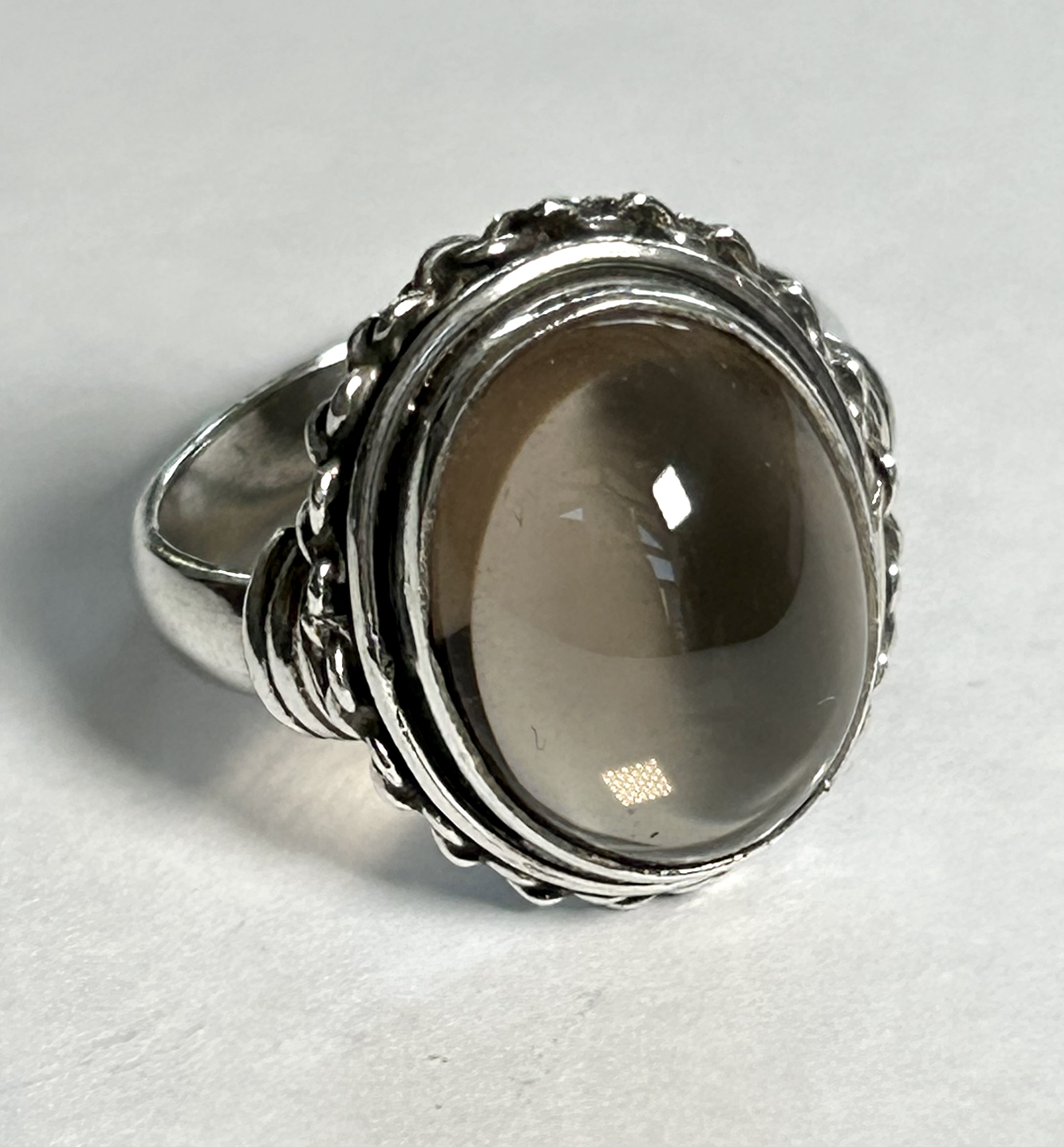 oval cabochon smokey quartz ring with sterling silver border (20mm x 15mm)